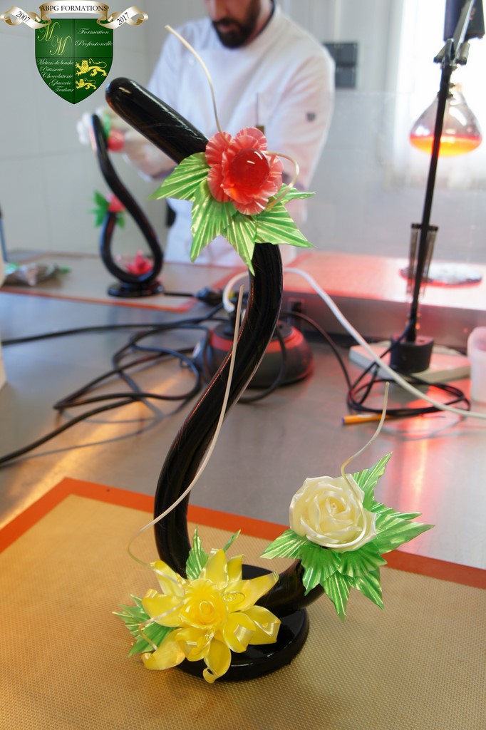 Réalisation d'une pièce à base de sucre coulé, soufflé, tiré, pastillage, aérographe